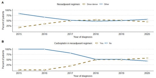 On average, 44.7% of patients who received neoadjuvant therapy were on a dose-dense regimen, and this percentage increased from 17% in 2015 to 53% in 2018, eventually stabilising at around 50% of cases. The dose-dense therapies were used in the adjuvant regimen, but to a much lesser degree and varied by year, ranging from 0% to 21% (details in Supplementary Materials: Table S4). Additionally, we noticed a significant increase in the use of carboplatin in the neoadjuvant regimen, reaching 57% in 2020 since its introduction in 2017 (Figure 4).