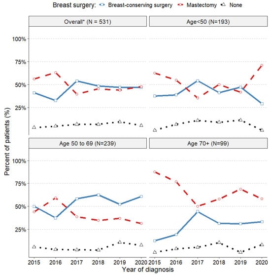 We categorised surgeries into two groups: “breast and lymph node conserving” (BLCS), which includes BCS and SLNB, and “more extensive surgeries,” involving mastectomy and/or axillary lymph node dissection (ALND) during the initial surgery. Patients who were operated outside of the MSCI and those not operated at all were excluded (N = 18 and N = 28, respectively). More details about surgery treatment modality among patients who received neoadjuvant therapy can be found in Supplementary Materials: Table S5.