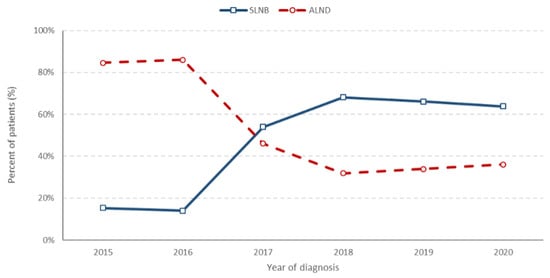 From 2017 onwards, axillary lymph node dissections (ALND) were only performed in accordance with specific guidelines, such as ACOSOG Z0011 [17] and EORTC 10981-22023 (AMAROS) [18], as well as ACOSOG Z1071 [19]. As a result, about two-thirds of patients who underwent surgery after 2017 only had a sentinel lymph node biopsy (SLNB) without a full ALND (Figure 6).