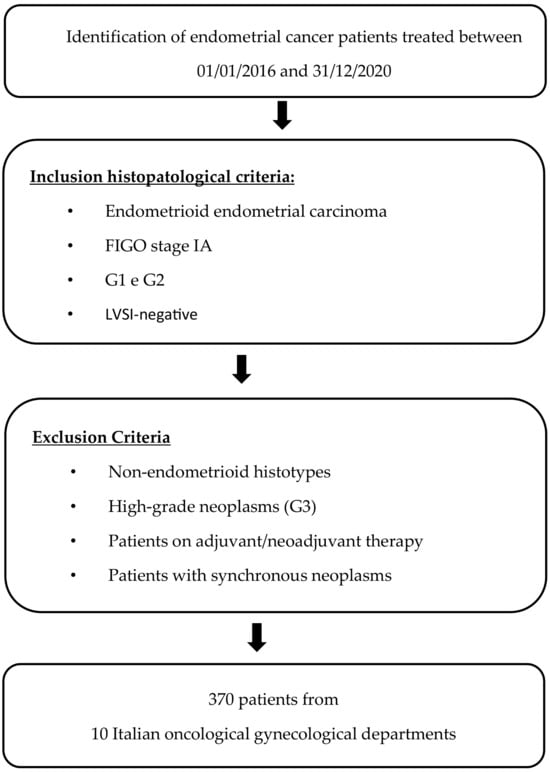 A retrospective, multicenter, observational study was conducted, including 370 patients with low-risk endometrioid EC treated from 1 January 2016 to 31 December 2020 in 10 different Italian gynecologic oncology departments (Santa Croce e Carle in Cuneo, Santa Maria della Misericordia in Udine, Policlinico Sant’Orsola in Bologna, Azienda Ospedaliera Universitaria Integrata di Verona, Ospedale Maggiore in Parma, Fondazione Giovanni Paolo II in Campobasso, Policlinico Martino in Messina, Sacro Cuore Don Calabria in Negrar, Ospedale di Polla S. Arsenio in Salerno, and Ospedale Martini in Torino).