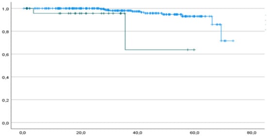 Only one patient died from the disease (0.3%), and she had p53wt. One-year OS was 100% and 99.7% in the p53abn and p53wt groups, respectively. Two-year OS was 100% and 99.1% in the p53abn and p53wt groups, respectively. The median OS was 21.9 months (IC 95% 16.4–30.1) for p53abn and 34.2 months (IC 95% 33.2–37.0) for p53wt patients (Figure 3).
