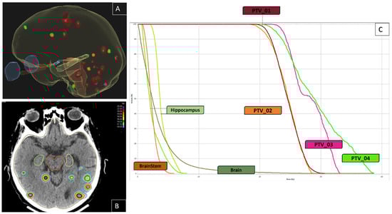 Illustration of a case of multiple brain metastases from lung cancer without drivers’ mutation treated in August 2018. In February 2021, he developed 16 BM. He had four sessions of SRS (20 Gray to the 70% isodose line): PTV_01 in February 2021 (n = 16); PTV_02 in May 2021 (n = 3); PTV_03 in August 2021 (n = 2); and PTV_04 in October 2021 (n = 3). He had no new brain metastases until the last MRI in April 2022. (A): three-dimensional image of the brain and the target BM: red: PTV_01; orange: PTV_02; pink: PTV_03; green: PTV_04. (B): axial CT-scan slice, showing the patient’s dose-color-wash, (C): Dose-Volume Histogram.