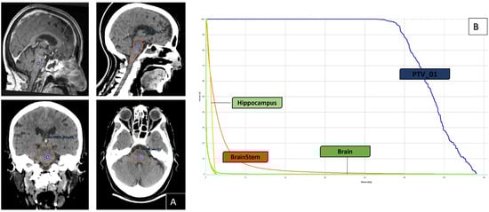 Illustration of the case of a single BSM from a melanoma without drivers’ mutation treated with one course of SRS (24 Gray to the 70% isodose line). (A): axial–sagital CT-scan and MRI slice, showing the target lesion and the patient’s dose-color-wash; (B): Dose-Volume Histogram.