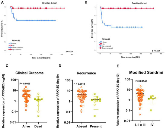 To further validate our findings, we analyzed the PRKAB2 gene expression in an independent Children Oncology Group cohort deposited in the Gene Expression Omnibus database (GSE76019) (n = 34). In this cohort, germline TP53 mutations were detected in 23 (67.6%) patients (10 R337H, 13 other TP53 mutations, 10 WT, and 1 patient without information). As in the case of our cohort, low PRKAB2 gene expression was associated with shorter overall (Figure 2A, p = 0.044) and event-free survival (Figure 2, p = 0.040); the median of the expression was used as the cut-off point for high or low expression. In addition, PRKAB2 underexpression was associated with poor clinical outcomes: this gene was less expressed in cases of death (Figure 2, p = 0.0116), unfavorable clinical events (recurrence, death, or metastasis) (Figure 2, p = 0.0094), and Sandrini IV staging (Figure 2, p = 0.0219).