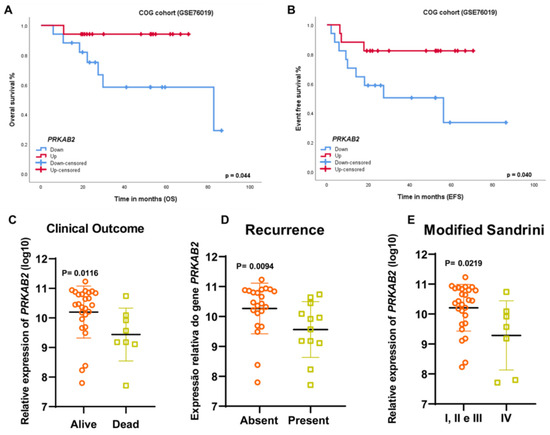 (A) Kaplan–Meier curves and log-rank tests in the COG cohort showing that patients with shorter overall survival (n = 17) had lower PRKAB2 gene expression compared to patients with longer overall survival (n = 17) (p = 0.044). (B) Patients with shorter event-free survival (n = 17) had lower PRKAB2 gene expression compared to patients with longer event-free survival (n = 17) (p = 0.040). (C) Patients who died showed lower PRKAB2 gene expression (p = 0.0116) (Mann–Whitney test). (D) Patients who presented recurrence followed by metastasis showed lower PRKAB2 expression (p = 0.0094) (Mann–Whitney test). (E) Patients with Sandrini IV staging showed lower PRKAB2 gene expression (p = 0.0219) (Mann–Whitney test).