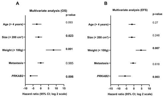 Multivariate analysis using the Cox regression model according to overall (OS) and event-free survival (EFS). (A) Overall survival: patient’s age > 4 years (p = 0.093), tumor size < 200 cm3 (p = 0.023), tumor weight < 100 g (0.001), presence of metastasis (p = 0.985), and lower PRKAB2 gene expression (p = 0.006). (B) Event-free survival: patient’s age > 4 years (p = 0.27), tumor size < 200 cm3 (p = 0.248), tumor weight < 100 g (p = 0.007), presence of metastasis (p = 0.618), and lower PRKAB2 gene expression (p = 0.003).