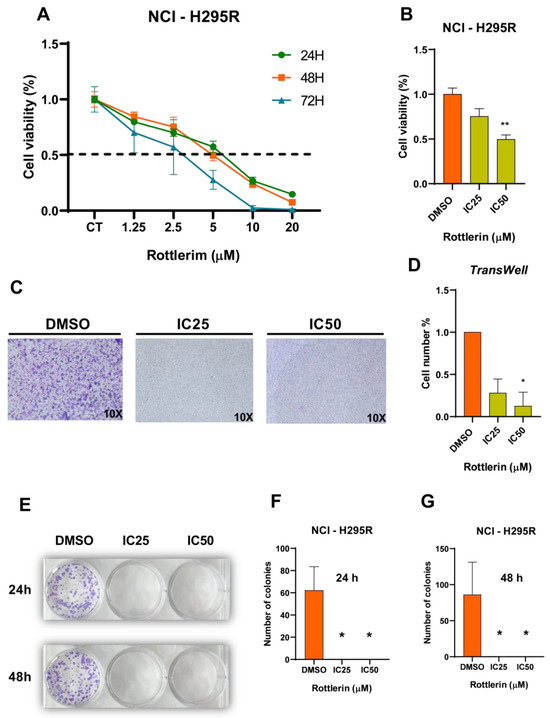(A) Cell viability curve for NCI-H295R cells after treatment with Rottlerin for 24, 48, or 72 h to calculate IC25 and IC50. (B) Rottlerin decreased cell viability at IC50 (** p = 0.0034). (C) Transwell test with DMSO or Rottlerin at IC50 or IC25 (D). Rottlerin at IC50 decreased cell migration (* p = 0.025). (E–G) Clonogenic assay using DMSO or Rottlerin at IC50 or IC25 showed that clonogenic capacity was reduced after treatment with Rottlerin for 24 h and 48 h at IC50 (* p = 0.0102) or IC25 (* p = 0.0102) (ANOVA test).
