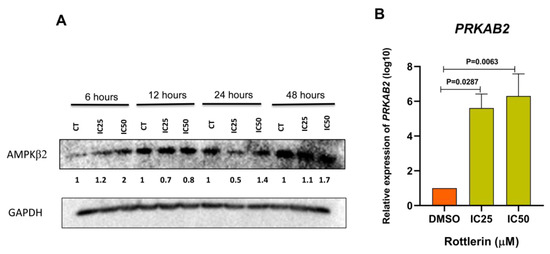 NCI-H295R cells treated with Rottlerin showed increased PRKAB2 gene and PRKAB2 protein expression. Treatment was carried out for different times: 6, 12, 24, or 48 h. The highest AMPKB2 protein expression level occurred after treatment with Rottlerin at IC50 for 6 h, when the protein level doubled compared to the control (DMSO). After treatment under these conditions for 48 h, the AMPKB2 protein level increased by 70% compared to the control (DMSO) (Figure 5A). Moreover, PRKAB2 gene expression increased after treatment with Rottlerin at IC50 (p = 0.0063) or IC25 (p = 0.0287) for 48 h (Figure 5B).