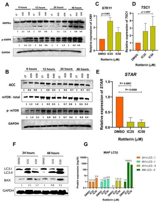 (A) Rottlerin increased the levels of total and Thr-172-phosphorylated AMPK in NCI-H295R cells. The percentage was greater after treatment with Rottlerin at IC50 for 6 h. (B) Treatment with Rottlerin at IC50 or IC25 for 12, 24, or 48 h reduced mTOR and p-mTOR activity in NCI-H295R cells, but mTOR activity was higher after treatment with Rottlerin at IC50 or IC25 6 h. (C) Rottlerin reduced STK11 gene expression in NCI-H295R cells (p = 0.0033). (D) Rottlerin at IC50 increased TSC1 gene mRNA (p = 0.0141) in NCI-H295R cells. (E) Rottlerin at IC50 or IC525 decreased STAR steroid factor gene expression (p = 0.0280 and 0.0061, respectively) in NCI-H295R cells. (F) Treatment with Rottlerin for 24 or 48 h induced the protein expression of autophagy (MAP LC3beta) and apoptosis (Bax) markers. (G) Protein quantification of the LC3beta autophagy marker. The uncropped blots are shown in File S1.