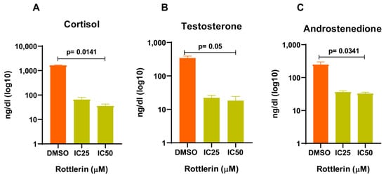 Hormone dosage after treatment with Rottlerin at IC50 or IC25. (A) The cortisol level was significantly reduced, and the reduction was more significant after treatment with Rottlerin at IC50. (B) The testosterone level was reduced, without statistical significance between the Rottlerin concentrations. (C) The androstenedione level was significantly reduced, and the reduction was more significant after treatment with Rottlerin at IC50. The Two-Way ANOVA test was used.