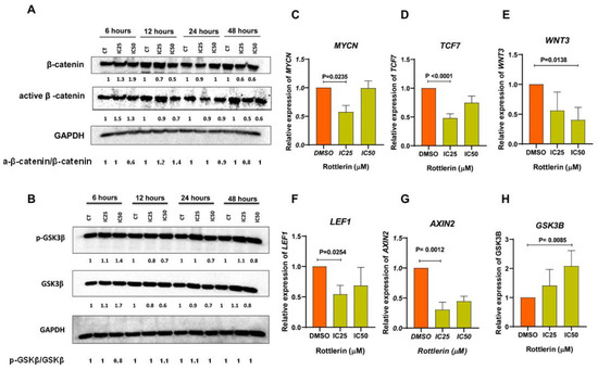 Treatment with Rottlerin decreased the β-catenin level in NCI-H295R cells. Cells treated with Rottlerin at IC50 or IC20 for 12, 24, or 48 h showed lower β-catenin and active β-catenin levels compared to the control (DMSO) (Figure 8). In addition, treatment with Rottlerin at IC25 decreased the expression of key genes in the Wnt/β-catenin pathway, such as MYCN (p = 0.0012), TCF7 (p ≤ 0.0001), LEF1 (p = 0.254), and AXIN2 (p ≤ 0.0001), and treatment with Rottlerin at IC50 decreased WNT3 gene expression. Treatment with Rottlerin at IC50 for 48 h increased GSK3B gene expression (Figure 8).