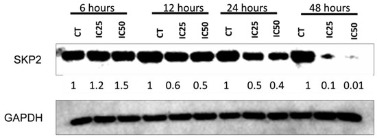 Rottlerin potently inhibited SKP2 protein expression. The highest inhibition rate was achieved after treatment with Rottlerin at IC50 for 48 h. However, inhibition was 50% after treatment with Rottlerin at IC25 for 12 or 24 h and 90% after treatment with Rottlerin at IC25 for 48 h (Figure 9).