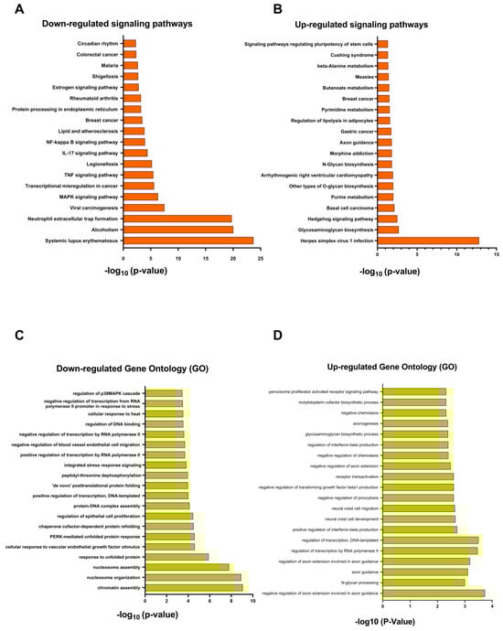(A) In orange, positively regulated pathways, with p < 0.05. (B) In green, gene ontology, positively regulated pathways, with p < 0.05. (C) In orange, negatively regulated pathways, with p < 0.05. (D) In green, gene ontology, negatively regulated pathways, with p < 0.05. Pathway enrichment was analyzed by using the Enrichr platform (https://maayanlab.cloud/Enrichr/ (accessed on 23 February 2023)).