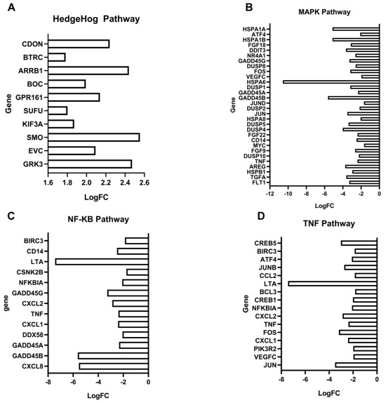 Pathway genes enriched during RNAseq analysis. (A) Hedgehog pathway gene expression level (p = 0.003) as LogFC. (B) MAPK pathway gene expression level (p < 0.001) as LogFC. (C) NF-KB pathway gene expression level (p = 0.002) as LogFC. (D) TNF gene expression level (p < 0.001) as LogFC.