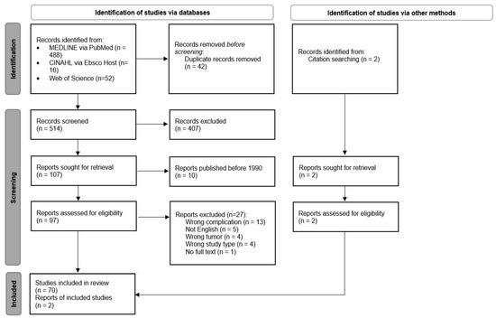Our systematic search retrieved 514 records. In total, 107 of 514 records were included in our study after abstract and title screening. Ten articles were excluded because they were published before 1990. Seventy-two articles were included in this review after full-text screening was performed. The majority (n = 58) were case reports or case series. Only 14 studies were observational studies.