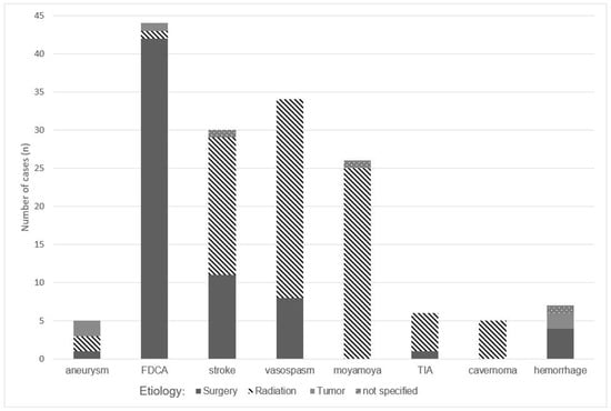 The number of published cases with neurovascular complications related to different etiologies. Abbreviations: FDCA: fusiform dilation of the carotid artery; TIA: transient ischemic attack.