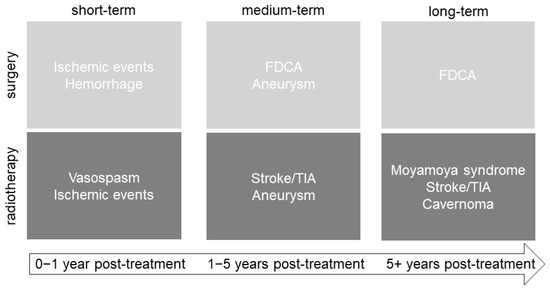 Figure 3 summarizes the short-, medium-, and long-term vascular complications of CP treatment via surgery and radiotherapy. Shortly after surgery (<1-year post-treatment), acute ischemic events and hemorrhage can occur. After radiotherapy, vasospasm and acute ischemic events were reported to be short-term complications (Figure 3). FDCA and aneurysm can be considered medium- or long-term consequences, occurring between one- and five-years post-surgery (Figure 3). Moyamoya syndrome and cavernoma are long-term complications following radiotherapy (more than 5 years post-treatment), whereas stroke/TIA and aneurysms are medium- to long-term complications of radiotherapy (Figure 3).