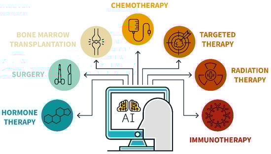Cancer treatment planning is a difficult issue. The treatment for various types of cancer is not only specific, but often has a number of side effects. In addition, assistance in the treatment of cancer requires a multidisciplinary approach and the involvement of various specialists: surgeons and radiologists, persons caring for patients during their rehabilitation, etc. Moreover, the emergence of new scientific discoveries in the field of oncology research leads to a change in existing paradigms of disease treatment. Finally, the types of cancer treatment assistance are divided into initial, curative, supportive care, and help with cancer relapses, as shown in Figure 2. All of the above points create significant difficulties in using AI for cancer treatment.