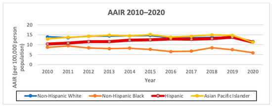 AAIR of overall thyroid cancer incidence from 2010 to 2020 in California by race/ethnicity (per 100,000 people).