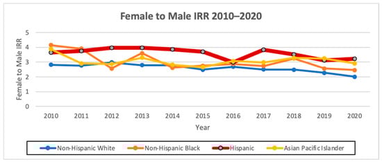 Female-to-male AAIR ratio from 2010 to 2020 in California by race/ethnicity.