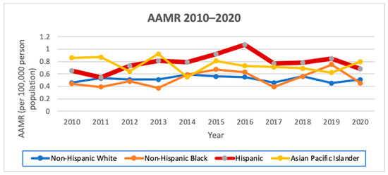 AAMR by race/ethnicity (per 100,000 people) by year from 2010 to 2020.