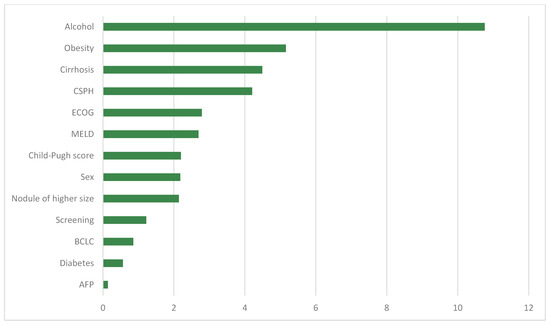 In Figure 2, the results of the developed predictive model are presented. Alcohol consumption emerged as the most important variable, followed at some distance by the second variable, obesity. The presence of cirrhosis and the presence of CSPH data were the subsequent variables concerning the mortality of these patients. Both variables showed a similar weight. The prognostic differences among ECOG, MELD, and Child–Pugh stage were not remarkable, as all three presented a similar value. The most significant factor was an advanced ECOG stage. It is noteworthy that alpha-fetoprotein (AFP) levels are insignificant for the prognosis of these patients.