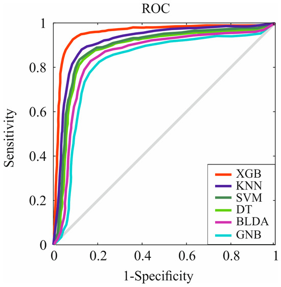 Representation of ROC curves of the analyzed algorithms. XGB: extreme gradient boosting. KNN: K-nearest neighbors. SVM: support vector machine. DT: decision tree. BLDA: Bayesian linear discriminant analysis. GNB: Gaussian naïve Bayes.