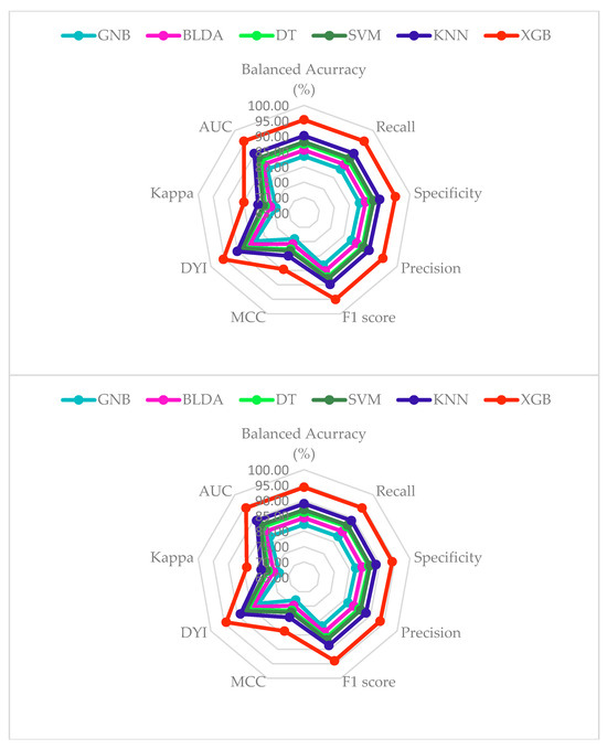 When MCC results are observed, there is a difference of 4.75% between XGB and KNN in favor of the proposed model. This is one of the most reliable statistical indices, yielding high values only when correctly performed across all four categories of the confusion matrix [45]. The differences are significantly higher when comparing the values of F1 score, Kappa, and DYI. Clearly, the differences are also more pronounced for the other proposed algorithms compared to XGB, ranging favorably between 8–12% for XGB. All the aforementioned data are detailed in Table 4.