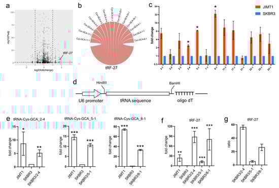 The overexpression of tRNA-Cys-GCAs stimulates tRF-27 accumulation. (a) The expression of tRF-27 in trastuzumab-resistant JIMT1 cells and trastuzumab-sensitive SKBR3 cells. (b) Isodecoders of tRNA-Cys-GCA have consistent sequence with tRF-27. (c) The expression of tRF-27-related tRNA-Cys-GCA in JIMT1 and SKBR3 cells. (d) The structure of the tRNA expression cassette, including the U6 promoter and oligo dT RNA pol III terminator. (e) The overexpression of tRNA-Cys-GCA_2-4, tRNA-Cys-GCA_5-1, and tRNA-Cys-GCA_8-1 in JIMT1 cells. (f) tRF-27 level after overexpression of three tRNA-Cys-GCAs. (g) The ratio between overexpressed tRNA-Cys-GCA and increased tRF-27. Three replicates were applied in each experiment. t-test was applied for statistical analysis. Data are shown as Mean ± SD. * p < 0.05, ** p < 0.01, *** p < 0.001.