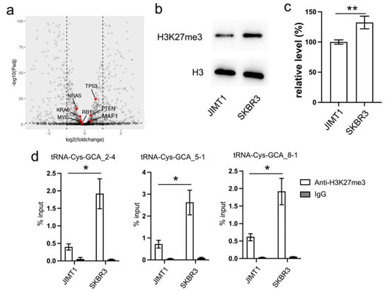 Reduced cellular H3K27me3 stimulates tRNA-Cys-GCA transcription. (a) The transcription states of several RNA pol III regulators in JIMT1 and SKBR3 cells. (b,c) The overall level of H3K27me3 in JIMT1 and SKBR3 cells. (d) The enrichment of H3K27me3 at the promoters of three tRNA-Cys-GCAs in JIMT1 and SKBR3 cells. Three replicates were applied in each experiment. T-test was applied for statistical analysis. Data are shown as Mean ± SD. * p < 0.05, ** p < 0.01. The uncropped blots are shown in Figure S3.