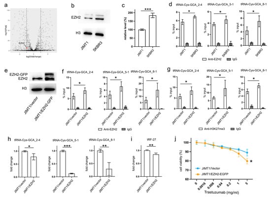Downregulated EZH2 increases tRNA-Cys-GCA transcription and tRF-27 accumulation. (a) The transcription states of EZH2 in JIMT1 and SKBR3 cells. (b,c) The protein level of EZH2 in JIMT1 and SKBR3 cell nucleus. (d) The enrichment of EZH2 at the promoters of three tRNA-Cys-GCAs in JIMT1 and SKBR3 cells. (e) The result of EZH2 overexpression in JIMT1 cell nucleus. (f) The enrichment of EZH2 at the promoters of three tRNA-Cys-GCAs in JIMT1 and EZH2-overexpressed JIMT1 cells. (g) The enrichment of H3K27me3 at the promoters of three tRNA-Cys-GCAs in JIMT1 and EZH2-overexpressed JIMT1 cells. (h) The transcription of tRF-27-related tRNA-Cys-GCAs in JIMT1 and EZH2-overexpressed JIMT1 cells. (i) The level of tRF-27 in JIMT1 and EZH2-overexpressed JIMT1 cells. (j) The viabilities of JIMT1 and EZH2-overexpressed JIMT1 cells treated with different concentrations of trastuzumab. Three replicates were applied in each experiment. T-test and ANOVA were applied for statistical analysis. Data are shown as mean ± SD. * p < 0.05, ** p < 0.01, *** p < 0.001. The uncropped blots are shown in Figure S3.