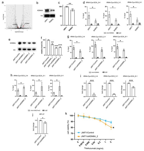Upregulated KDM6A increased tRNA-Cys-GCA transcription and tRF-27 accumulation. (a) The transcription states of KDM6A and KDM6B in JIMT1 and SKBR3 cells. (b,c) The protein level of KDM6A in JIMT1 and SKBR3 cell nucleus. (d) The enrichment of KDM6A at the promoters of three tRNA-Cys-GCAs in JIMT1 and SKBR3 cells. (e,f) KDM6A knockdown in JIMT1 cell nucleus. (g) The enrichment of KDM6A at the promoters of three tRNA-Cys-GCAs in JIMT1 and KDM6A-knockdown JIMT1 cells. (h) The enrichment of H3K27me3 at the promoters of three tRNA-Cys-GCAs in JIMT1 and KDM6A-knockdown JIMT1 cells. (i) The transcription of tRF-27-related tRNA-Cys-GCAs in JIMT1 and KDM6A-knockdown JIMT1 cells. (j) The level of tRF-27 in JIMT1 and KDM6A-knockdown JIMT1 cells. (k) The viabilities of JIMT1 and KDM6A-reduced JIMT1 cells treated with different concentrations of trastuzumab. Three replicates were applied in each experiment. T-test and ANOVA were applied for statistical analysis. Data are shown as Mean ± SD. * p < 0.05, ** p < 0.01, *** p < 0.001. The uncropped blots are shown in Figure S3.