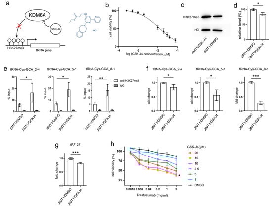 GSK-J4 reduces tRNA-Cys-GCA transcription and tRF-27 accumulation. (a) The principle that GSK-J4 inhibits the activity of KDM6A and diminishes H3K27me3. (b) The viabilities of JIMT1 cells treated with different concentrations of GSK-J4. (c,d) The overall H3K27me3 level in JIMT1 and GSK-J4-treated JIMT1 cells. (e) The enrichment of KDM6A at the promoters of three tRNA-Cys-GCAs in JIMT1 and GSK-J4-treated JIMT1 cells. (f) The transcription of tRF-27-related tRNA-Cys-GCAs in JIMT1 and GSK-J4-treated JIMT1 cells. (g) The level of tRF-27 in JIMT1 and GSK-J4-treated JIMT1 cells. (h) The viabilities of JIMT1 cells treated with different concentrations of GSK-J4 and trastuzumab. Three replicates were applied in each experiment. T-test and ANOVA were applied for statistical analysis. Data are shown as Mean ± SD. * p < 0.05, ** p < 0.01, *** p < 0.001. The uncropped blots are shown in Figure S3.