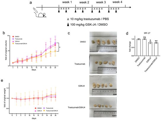 JIMT1 cells were injected into the lower flanks of 6-week-old BALB/c nude mice. When the tumor volume reached approximately 40 mm3, mice were treated with trastuzumab (10 mg/kg) or PBS at the 1st and 4th days of each week and GSK-J4 (100 mg/kg) or DMSO from the 1st to 5th days of each week for 4 weeks via intraperitoneal injection. Tumor volume was calculated as 0.5 × width2 × length.