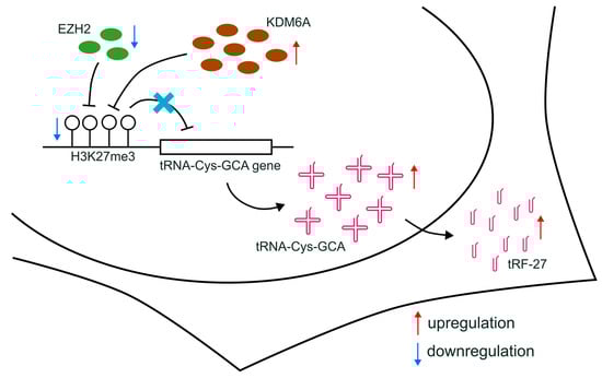 Schematic diagram of the proposed mechanisms. The downregulation of EZH2, combined with increased KDM6A expression, leads to the reduction in H3K27me3 levels at the promoters of tRNA-Cys-GCA genes and the upregulated transcription of tRNA-Cys-GCA, resulting in subsequently increased cellular levels of tRF-27.