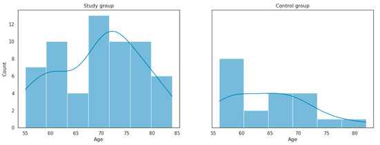 The comprehensive study encompassed a total of 80 patients, with a mean age of 68.4 ± 8.2, divided into the experimental and control groups. The study population consisted of 60 patients aged 55 to 85 years, undergoing treatment at the Lower Silesian Center of Oncology in Wrocław for breast or prostate cancer. The mean age within this group was 69.6 ± 8.3 (Table 1). Among these, there were 22 female and 38 male participants (Table 2). The control group comprised 20 patients from the Old Town Clinic in Wrocław, aged 55 to 85 years, without neoplastic diseases. This group consisted of 13 females and 7 males (Table 2), with a mean age of 64.9 years ± 7.2 (Table 1).