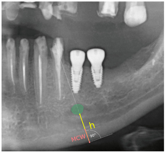 Based on these measurements, the panoramic mandibular index (PMI) was calculated. The panoramic mandibular index (PMI) was computed as the ratio of MCW/h [27]. PMI was calculated as the ratio of the thickness of the mandibular corpus compact bone (MCW) to the height measured from the lower border of the mandible to the lower edge of the mental foramen (h). A value greater than 0.3 is considered the norm [28,29].