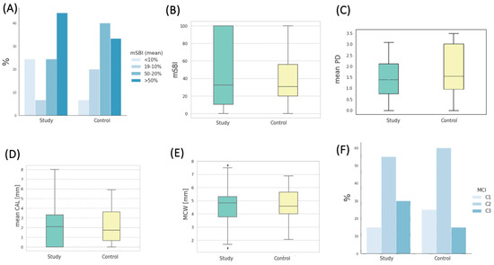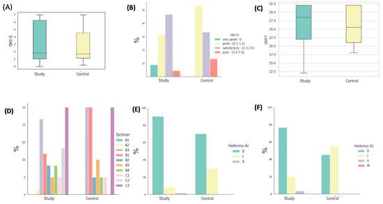 Graphical representation of statistical analysis. (A) Distribution of OHI-S index values in the investigated groups. (B) The proportions of patients within the studied groups classified into four interpretative intervals of the OHI-S index. (C) The distribution of DMFT (Decayed, Missing, Filled Teeth) index values in the studied groups. (D) Percentages of patients in the studied groups classified into interpretative intervals of Eichner’s classes. (D) Percentage distribution of patients within the studied groups categorized into three interpretative intervals of the Helkimo Ai index. (E) Percentage distribution of patients within the studied groups categorized into three interpretative intervals of the Helkimo Ai index. (F) Percentages of patients in the studied groups classified into four interpretative intervals of the Helkimo Di index.