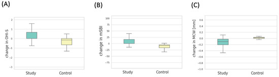 A comparison of the changes in the mSBI index in correlation with changes in the OHI-S index was performed in both groups—experimental and control. A decrease in the OHI-S index in the control group correlated with a decrease in the mean mSBI value in the control group (p < 0.001, corr = 0.78) (Figure 6C). In the experimental group, there was no correlation between an increase in the OHI-S index and an increase in the mean mSBI value (p = 0.09, corr = 0.26), as shown in Figure 6D.