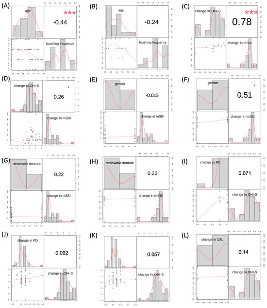 A comparison of changes in average CAL measurement in correlation with changes in the OHI-S index was performed in both groups—experimental and control. The results are presented in Figure 6K,L. There was no correlation between an increase in the OHI-S index and an increase in the mean CAL value in both the experimental group (p = 0.71; corr = 0.06) and the control group (p = 0.61; corr = 0.14), respectively.