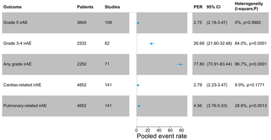 Meta-analysis of the outcomes. Cardiac-related irAEs include pericarditis, heart failure, pericardial fluid, myocarditis, atrial fibrillation. Pulmonary-related irAEs include pneumonitis, dyspnea, pneumonitis, respiratory failure, pleural effusion, and pleural infection. PER: pooled events rate.