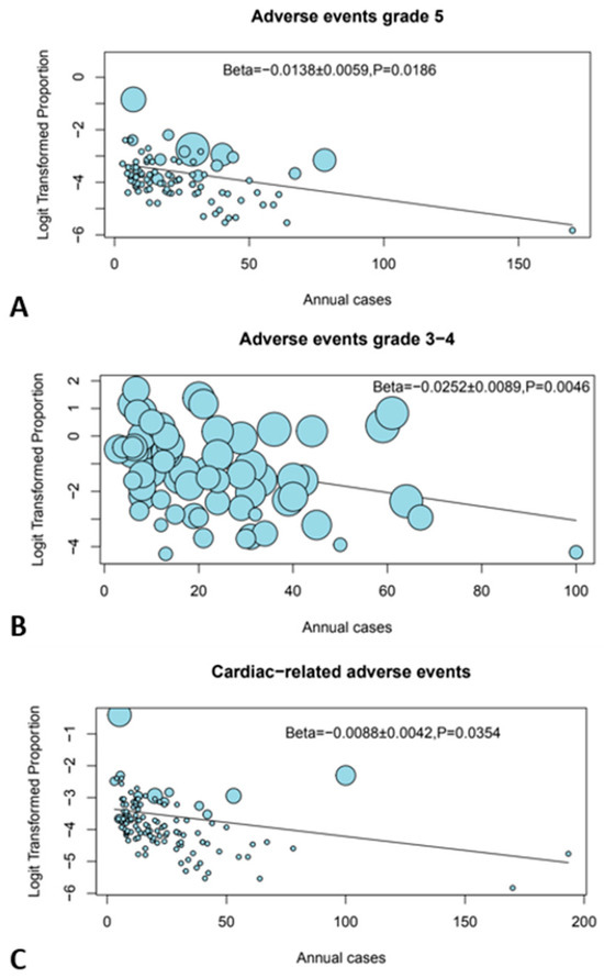 Bubble plots showing the effect of center volume. (A) Grade 5 AEs, (B) grade 3–4 AEs, and (C) cardiac-related AEs.