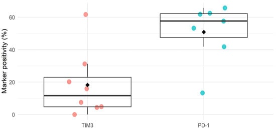 In ovarian cancer, no clinical studies have been conducted testing the efficacy of TIM3 immune checkpoint inhibition so far. One phase I/IIb trial (NCT02608268) showed a tolerable profile of anti-TIM3 treatment alone and in combination with an anti-PD1 ICI in patients with advanced solid tumors, of which 17% were of ovarian origin, although no follow-up study has been reported so far [30]. However, increased TIM3 expression on immune cells has been associated with a more advanced disease stage and decreased survival in ovarian cancer patients [24,31]. This prognostic value of TIM3 could be associated with a suppressed immune response in HGSOC, suggesting that TIM3 expression may be important as a biomarker in this disease [32]. Based on a literature search, a total of 45 publications (both published papers and conference abstracts) discussed immune checkpoint expression levels in ovarian cancer. Most data concerned immune infiltrate analysis on tumor biopsies of ovarian cancer patients. Despite large heterogeneity between study types, an average of 20% positivity in marker expression was reported for TIM3, which is in contrast with the more highly expressed PD1 levels (on average by 50% of the investigated cells) (Figure 1, additional information in Supplementary Table S1). However, in a study by Blanc-Durand et al., a significantly higher expression of TIM3 (76%) was observed compared to PD-L1 (28%) on ovarian cancer tumor samples of 90 and 173 patients, respectively. Interestingly, they observed no change in TIM3 levels induced by platinum-based chemotherapy, which did increase the percentage of PD-L1-positive tumors [33].