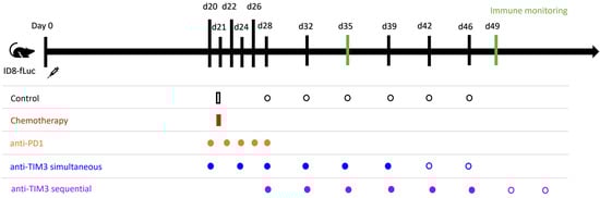 Treatment schedules are displayed in Figure 2. Chemotherapy consisted of carboplatin (100 mg/kg) combined with paclitaxel (10 mg/kg) and was administered intraperitoneally on day 21 post-inoculation. Immune checkpoint inhibitor treatments were administered through intraperitoneal injection. The anti-PD1 checkpoint inhibitor (BioXcell (clone RMP1-14)) was administered (50 µg/injection) every two days for a total of five administrations starting on day 20 post-inoculation. Anti-TIM3 was obtained via GSK (formerly TESARO) (clone SR13167) and BioXcell (clone RMT3-23) and was administered (350 µg/injection) following a biweekly schedule for three to four weeks, as indicated in Figure 2. The anti-TIM3 dose was selected based on a dosing study performed previously in this model. All treatments were diluted using DPBS before injection. Control mice received DPBS vehicle administration. Two administration schedules were tested, starting either on day 20 (in the simultaneous scheme) or day 28 (in the sequential scheme). A total of five in vivo experiments were performed, in which different treatment combinations and administration schedules (shown in Figure 2) were tested.