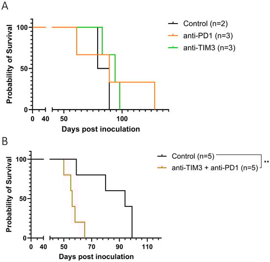 Kaplan-Meier curve showing the survival of ID8-fLuc bearing mice following monotherapy (A) or combined immune checkpoint inhibition (B). Mice were treated with either vehicle control injections with DPBS, anti-PD1 (50 µg, day 20/22/24/26/28) or anti-TIM3 (350 µg, sequential treatment scheme, day 20/24/27/31/34/38) or a combination of both immune checkpoint inhibitor treatments, intraperitoneally. ** p-value: 0.0064.