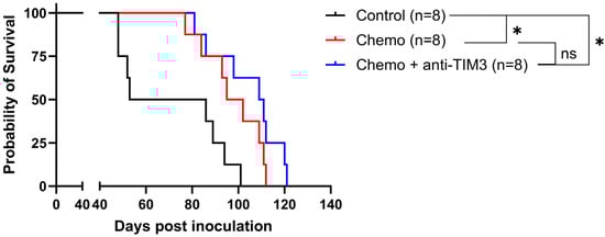 Kaplan-Meier curve showing the survival of ID8-fLuc bearing mice following simultaneous administration of chemotherapy and anti-TIM3. All mice were treated with either vehicle control, chemotherapy consisting of carboplatin (100 mg/m)g and paclitaxel (10 mg/kg) or a combination of chemotherapy and anti-TIM3 ICI in the simultaneous treatment scheme (350 µg, day 20/24/27/31/34/38), through intraperitoneal injections. * p-value < 0.05, ns = not significant.