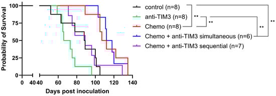 A literature review by our group demonstrated that the order of the treatments can influence the survival outcome [36]. Therefore, different administration orders of the combination with carboplatin-paclitaxel and TIM3 inhibition were explored in the following experiment. Similar to the previous set-up, chemotherapy was administered in a single injection on day 21. However, biweekly anti-TIM3 administration was given either simultaneously starting on day 20 or sequentially starting on day 28, following the administration schemes shown in Figure 2. Survival is displayed in Figure 5.