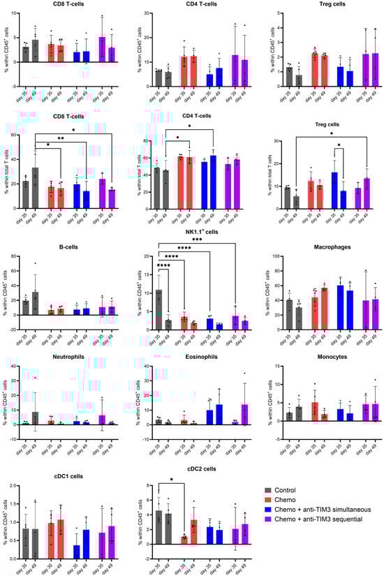 Natural killer cells (NK1.1+) were decreased in all treated groups compared to controls on day 35. Moreover, in the control group, NK1.1+ cells were significantly lower at day 49 compared to day 35. The conventional dendritic cell 2 (cDC2) population showed a decreased level in chemotherapy-treated mice compared to controls on day 35.