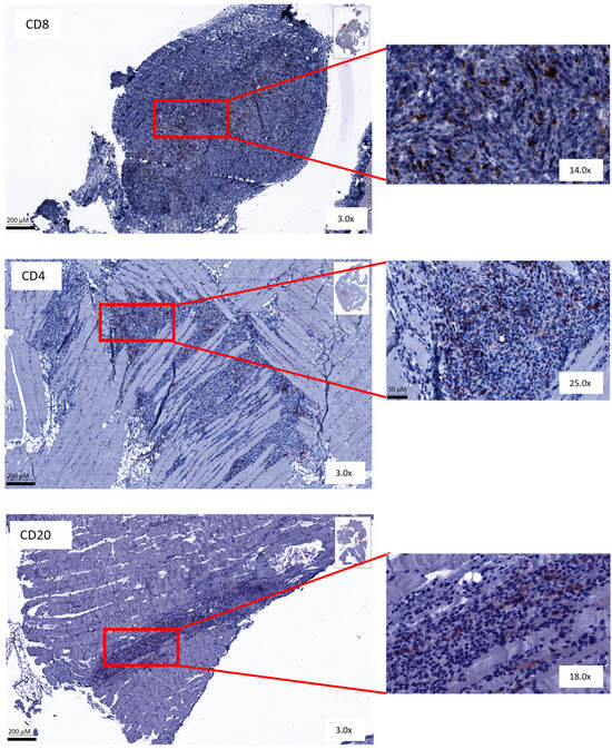 Immunohistochemical analysis was performed on peritoneal biopsies of mice at predefined time points (day 35 and day 49 post-inoculation). Tissue samples were stained for CD8, CD4 and CD20 markers. The total number of positively stained cells was measured per tumor area. Representative images of all staining procedures are displayed in Figure 7 and Supplementary Figures S8 and S9.