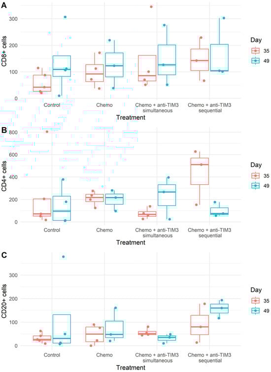 Box plots showing the average number of positively stained ((A) CD8+; (B) CD4+; (C) CD20+) cells per mm2 of tumor area in peritoneal biopsies. Mice were treated with carboplatin (100 mg/kg) + paclitaxel (10 mg/kg) chemotherapy with or without anti-TIM3 (350 µg/injection) in different administration schedules. Simultaneous administration (D20/24/27/31/34/38) or sequential administration (D28/32/35/39/42/46).